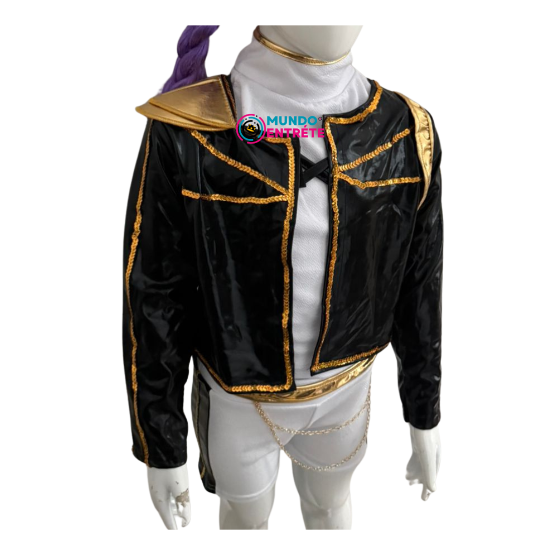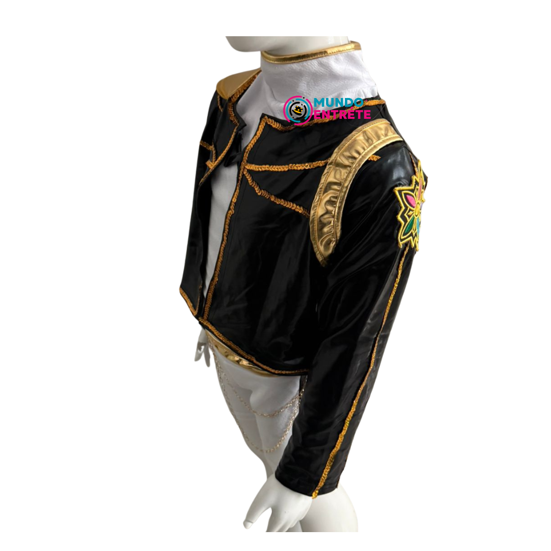 👗 Incluye: chaqueta negra con detalles dorados, short blanco con cadena decorativa y cuello alto estilo idol.